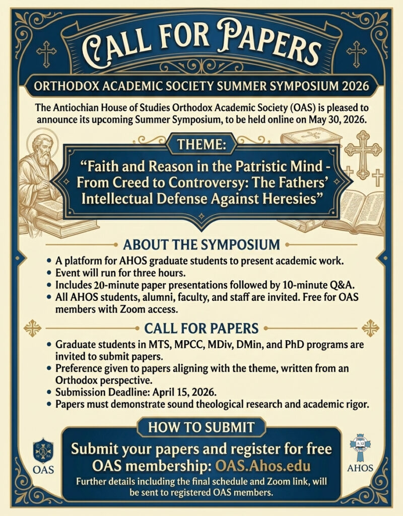 The Antiochian House of Studies Orthodox Academic Society (OAS) is pleased to announce its upcoming Summer Symposium, to be held online on May 30, 2026.